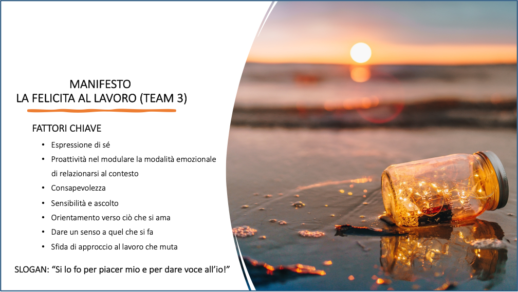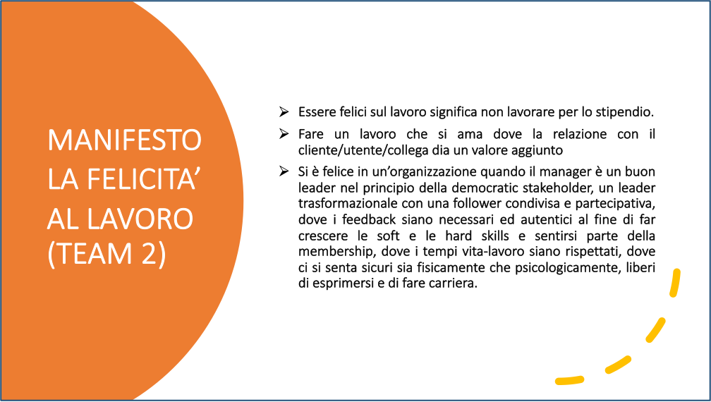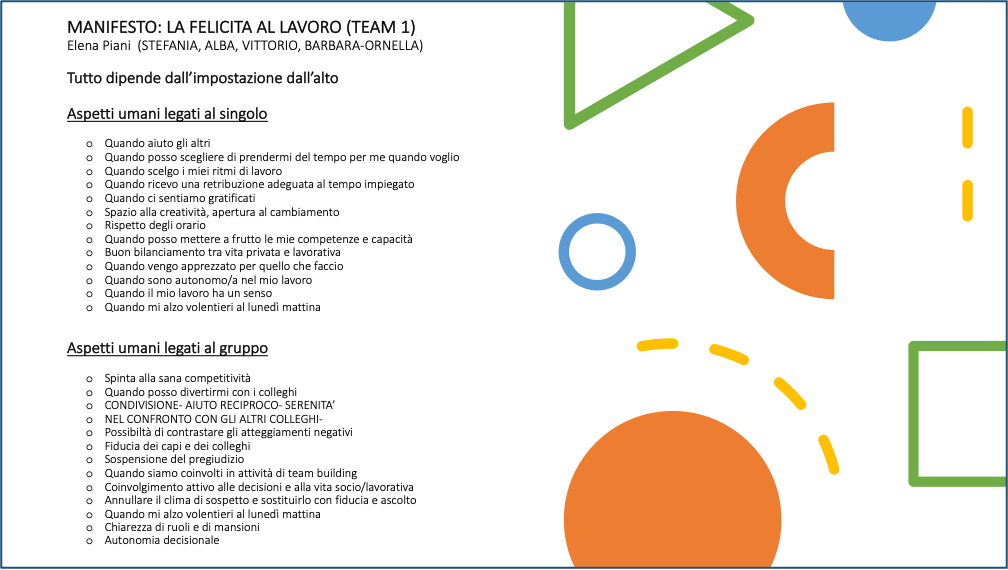 Tutti i gruppi hanno lavorato con piacere nel confronto e nella condivisione degli elementi che ciascun partecipante riteneva utili alla ricerca della felicità sul luogo di lavoro. Le diverse esperienze di chi lavora stabilmente all’interno di organizzazioni pubbliche o private e di chi opera come consulente libero professionista hanno arricchito la riflessione fornendo diversi punti di vista e differenti priorità.