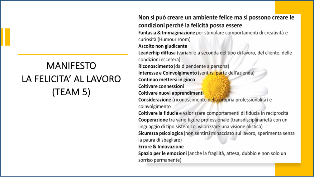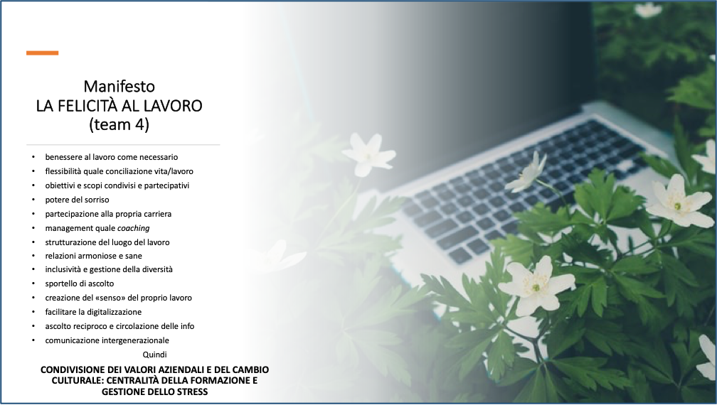 Nel webinar tenuto per AIF il 28 marzo 2022, dopo aver illustrato alcuni aspetti importanti della felicità al lavoro, abbiamo diviso i partecipanti in sottogruppi e chiesto loro di confrontarsi per definire insieme il “Manifesto della felicità al lavoro”.